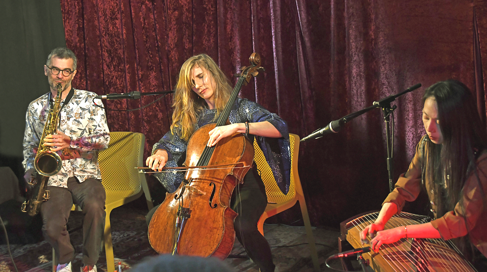 Entre folk, musique traditionnelle chinoise, jazz et musique contemporaine, Parade diffuse un son inédit. Basé sur des compositions de Ferdinand Doumerc, le répertoire du trio laisse également la place à divers moments d’improvisation. Alors que les membres du groupe aiment jouer avec l’utilisation de l’électronique dans d’autres formations, le trio prend ici le parti d’une musique acoustique. Parade axe donc son travail sur le mélange des timbres, sur la richesse de l’arrangement, sur la force de la narration. Le son du groupe s’appuie sur trois instruments bénéficiant d’une identité sonore forte : la large palette du guzheng (instrument à cordes chinois évoquant autant la mandoline que la kora, la harpe qu’une percussion inclassable) répond à la noblesse, au lyrisme et à la force du violoncelle, tandis que le saxophone amène une couleur presque vocale à l’ensemble, un souffle évocateur.