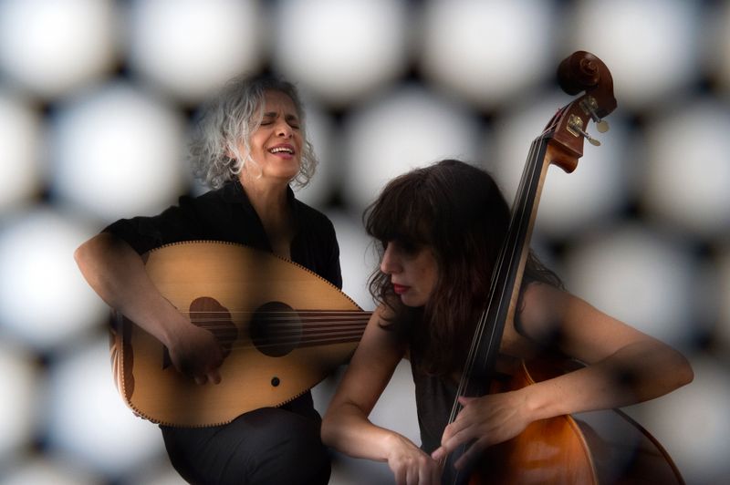 Ce duo inséparable est une première à Oloron. La chanteuse, oudiste et compositrice Kamilya Jubran, née de parents palestiniens, naturalisée française et se définissant comme « palestinienne de coeur », a été à l’origine du projet de création Sodassi en 2017 avec 6 artistes du Proche-Orient mêlant tradition et expérimentations. Elle se produit ce soir avec sa fidèle comparse Sara Murcia, contrebassiste et aussi compositrice et arrangeuse, qui a eu pour maître Jean-François Jenny-Clarke, grand contrebassiste trop tôt disparu ; au début de sa carrière, elle a accompagné entre autres CharlÉlie Couture et a joué dans la formation de Steve Coleman et du Magic Malik Orchestra : il y a références moins prestigieuses…